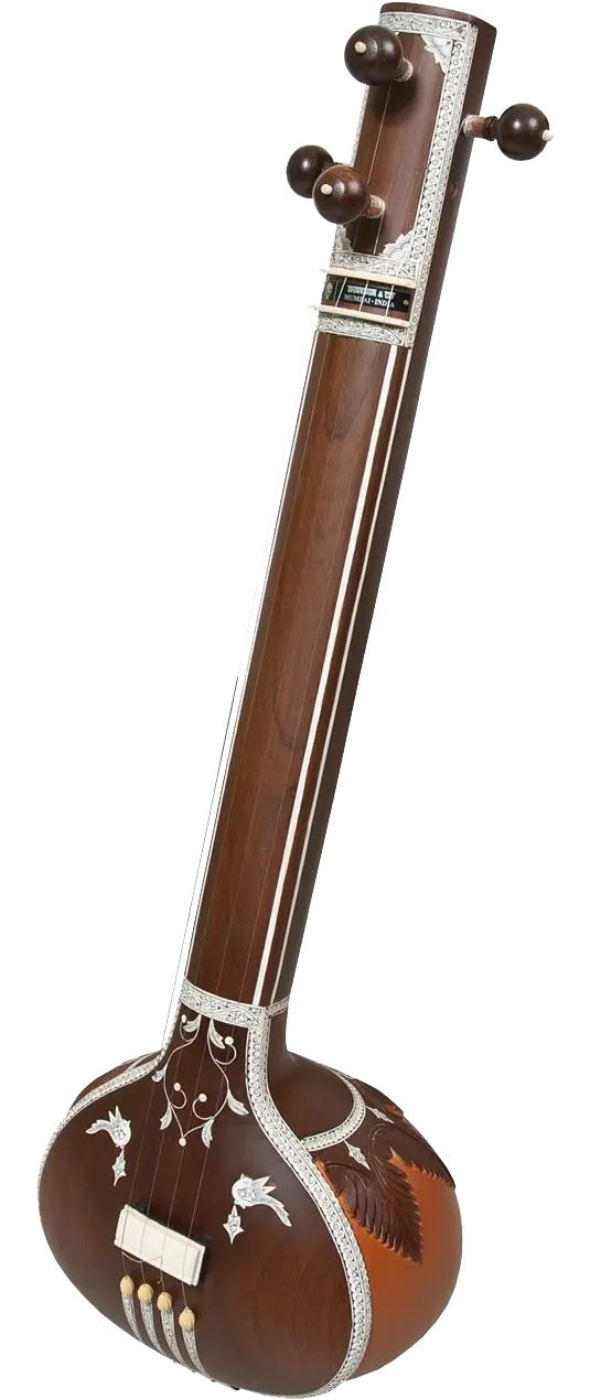 Like the sitar, the tanpura produces a sound rich in overtones. The body and neck are similar to the sitar, although the tanpura has no frets. It is usually carved from the hard wood of the breadfruit tree. The tanpura usually has four or five metal strings. These are plucked unplucked